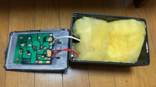 ねちょねちょと戦いながらネットワークとご対面です ウーハー・ツイーターそれぞれ12dbで切っています 過大入力防止のサーキットブレーカーが見えます、2Aだったかな 電解コンデンサーもSANYO製、もう一つの小さい方もSANYOですここまでSANYOだといよいよSAN…